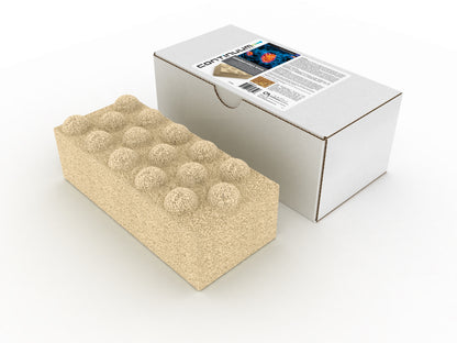 One Exxodus•Nitryx brick will provide denitriication for about 1,000 U.S. gallons, ( 3,800 L ) of aquarium volume. Rinse brick gently in purified tap water or aquarium water. Pre-seed the product by placing it in a plastic container, submerged in aquarium water, and adding the recommended dose for your aquarium size of the aforementioned bacterial products (BacterClean or BacterGen). Allow the product to remain in this soak for 12 to 24 hours, stirring gently occasionally or agitating the liquid by pouring out and back into the container, gently. Place the seeded Exxodus•Nitryx brick into system. The use of a pre-filtration filter floss, sponge or other mechanical pre-filtration is recommended to prevent fouling in flow through applications.