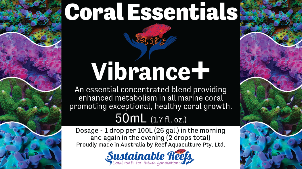 Our Coral Essentials, Vibrance+ is a blend of water soluble, organically found and synthetic compounds. It plays a vital role in aiding rapid cell division and growth. It is vitally involved in the metabolism of living cells, especially affecting protein synthesis and metabolism of fatty acids and Amino acids. Vibrance+ brings vigour and health to your coral, polyp extension and activity is improved. Nothing gives your tank an active boost like Vibrance+. Excess Vibrance+ not used in the tank is easily removed through standard organic waste processes and skimming.